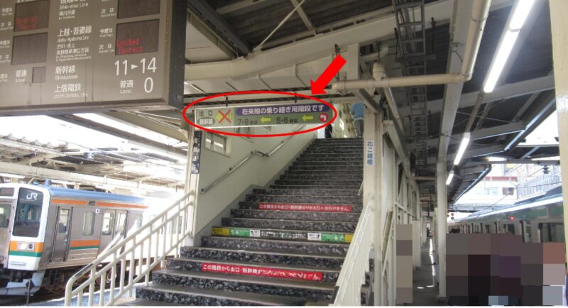 振り返ってホームの一番北側(新前橋方)の階段は乗り換え用の階段なので改札に行けない。まあ隣のホームに行ってからエスカレーター上がれば改札に出られるが