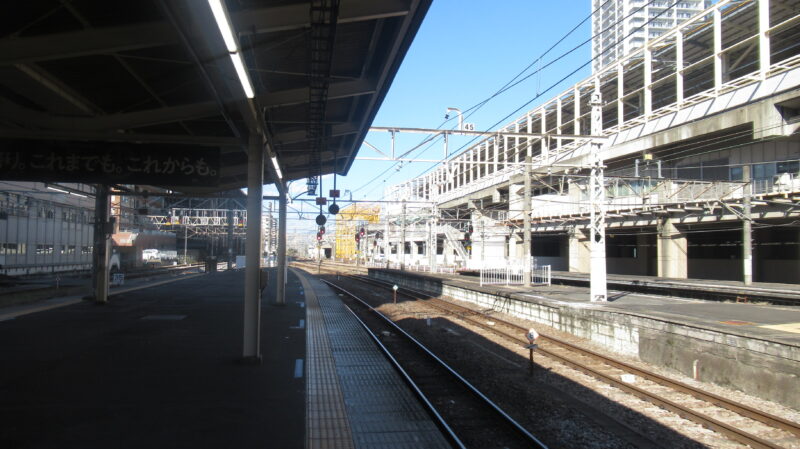 高崎駅ホームから新前橋方を見る、右上に新幹線ホームがある