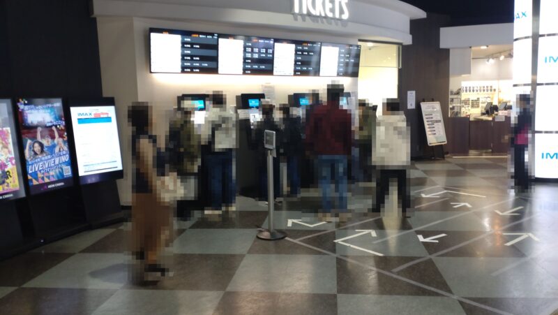 券売機はキャッシュレス専用を含め4台。 1列に並ばせるコンビニタイプは行列が長くなってしまうが運に左右されなくて良い。 上映時間まであまりないが余裕を持ってチケットゲット。 IMAX鑑賞だがハッピー55で1600円で購入。