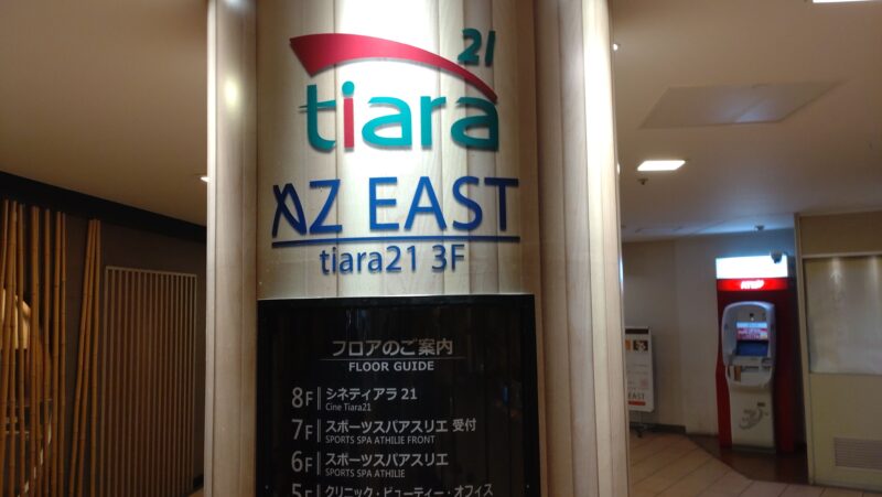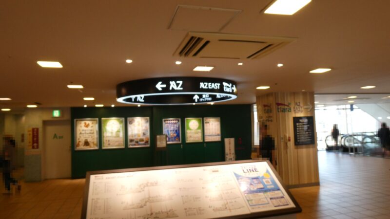 ティアラ21というのは駅ビル「アズイースト」のテナント街。 この8Fに映画館「シネティアラ21」がある。 アズイーストはアズ本館とつながっているので気にする必要はなし。 入口を左に入ってアズイーストへ入館。