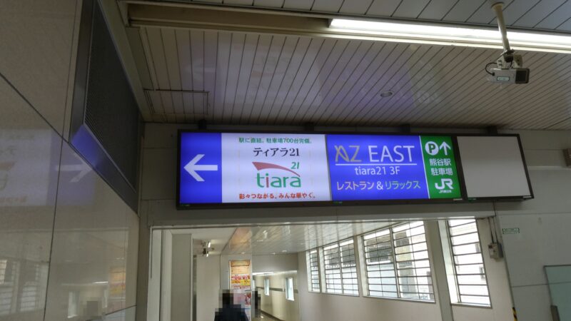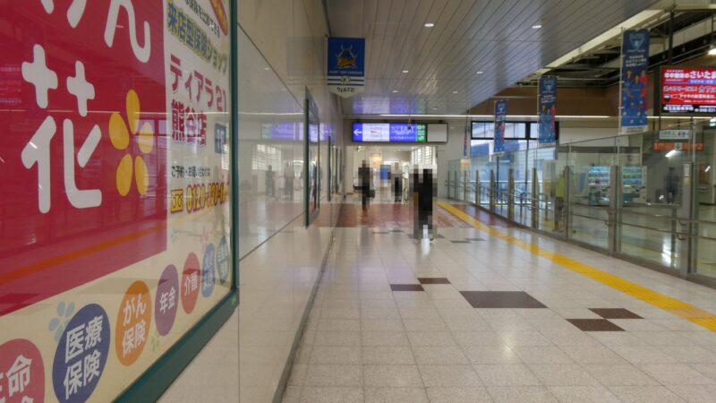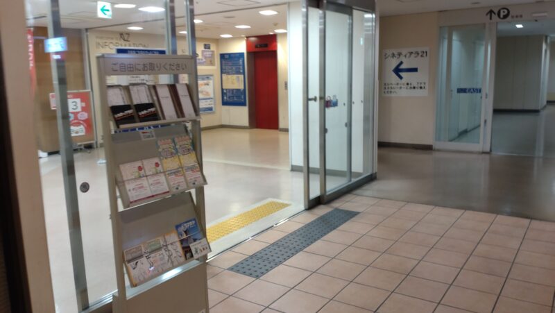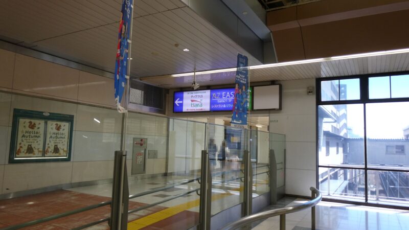 更に右を見ると一番南側の入口。 ティアラ21の案内もあるのであそこから入ろう。 では改札へ。