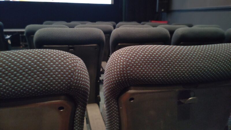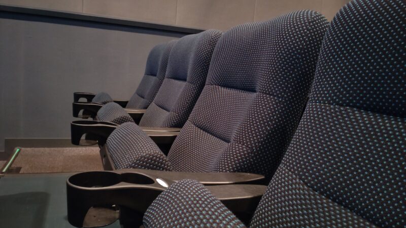 前方E列までフラットで段差ができるF列の席をゲット。 ここもミニシアターらしい背もたれの低いシート。 しかし肉厚のシートで座り心地は良い。