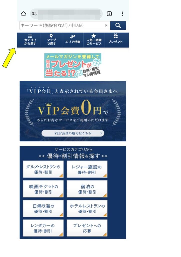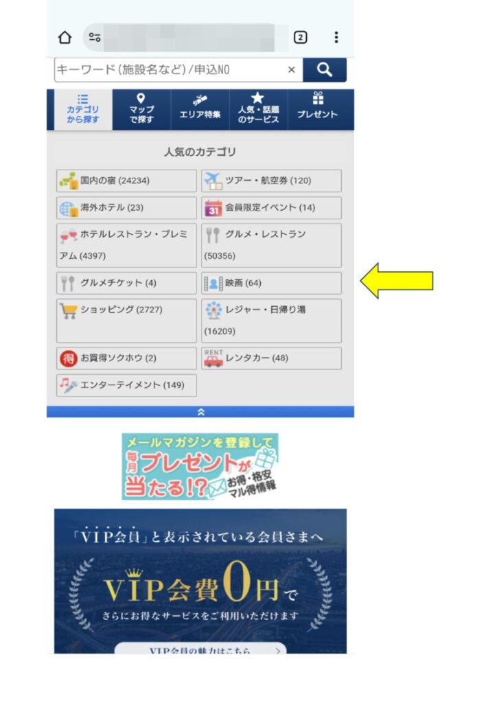 ソニー損保のクラブオフにログインしたページ。 たぶん他の保険会社でも同じような画面になるハズ。 ここの下段の四角、「映画チケットの優待・割引」をクリックするとムビチケが出てくる。 これはこれで良いのだがこれではない。 まず上段矢印の「カテゴリから探す」をタップ。