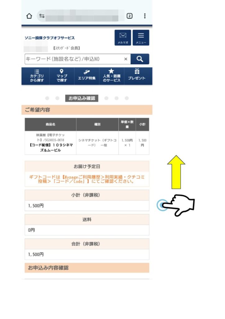 出てきた。 109シネマズで郵送チケットではなくコード配信になっている。 間違いなければ矢印の「会員特典」の欄をタップ。