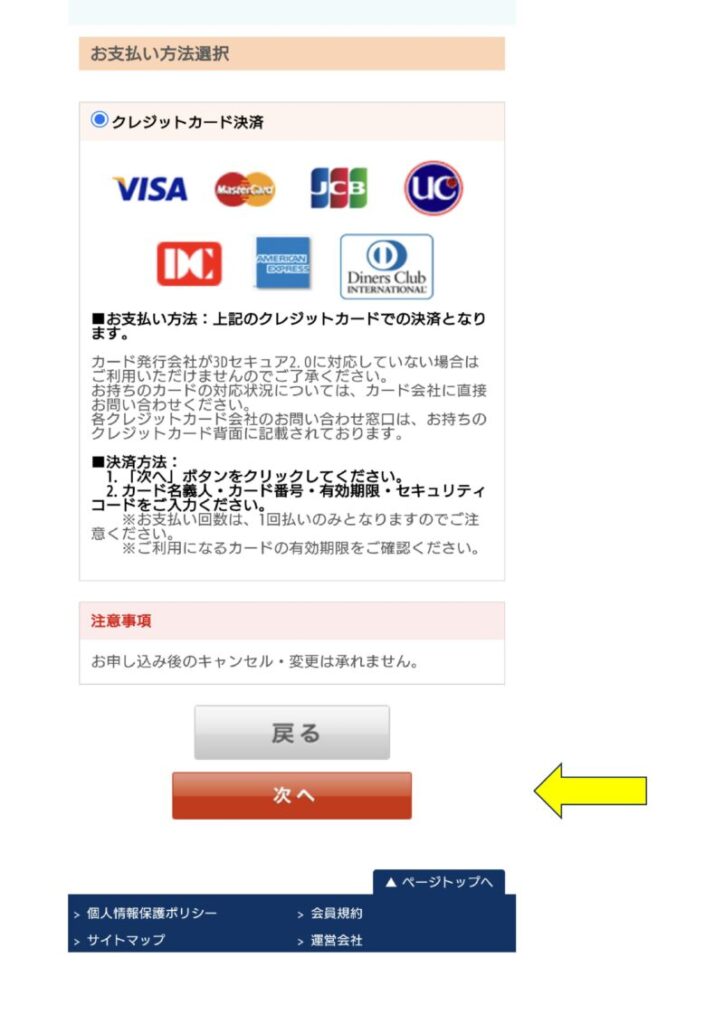 しつこいがクレジットカード支払いのみ。 「次へ」をタップ。