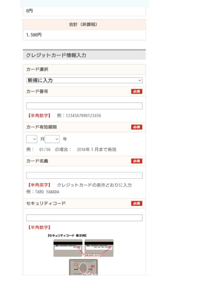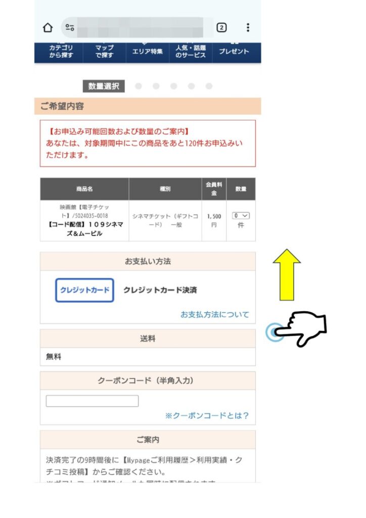 支払いの画面になるがクレジットカード決済のみで選択肢はない。 上へスライド。