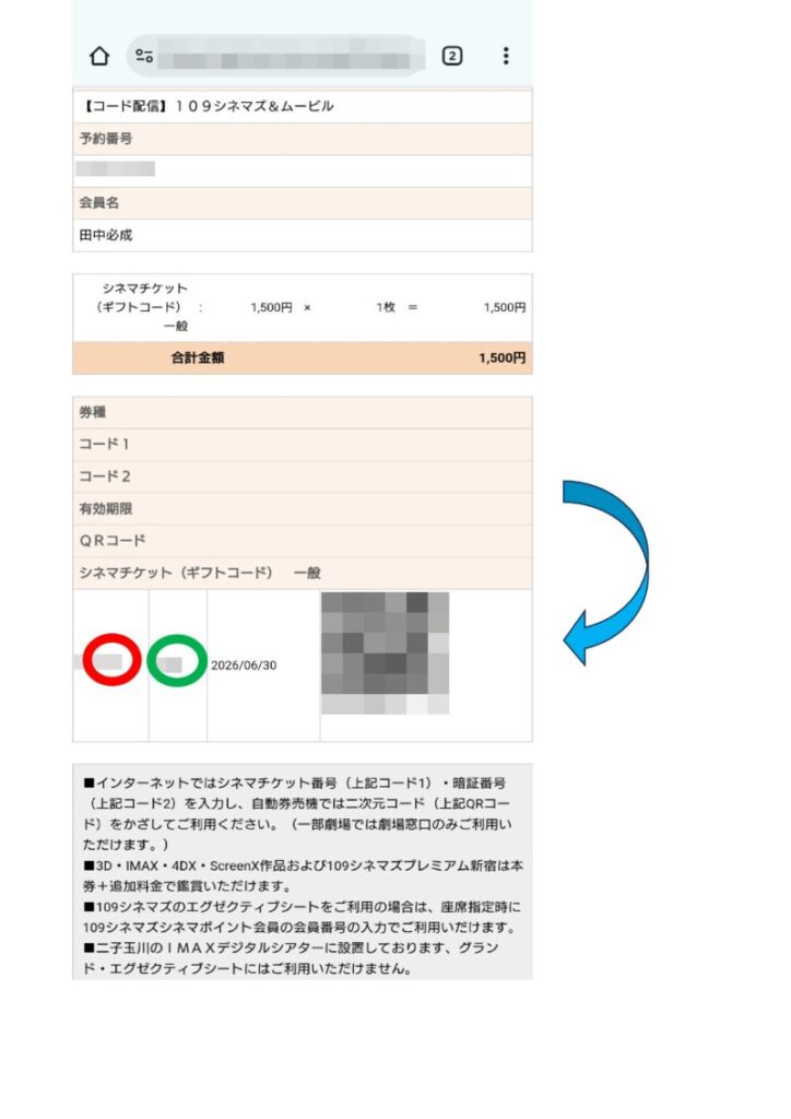 これがシネマチケット。 ちょっと見づらい。 画面の赤○には数字が並んでいてこれがコード1、隣の緑○にアルファベットが並びこれがコード2となり、オンライン予約ではこのふたつをシネマチケット番号・暗証番号に入力して予約をする。