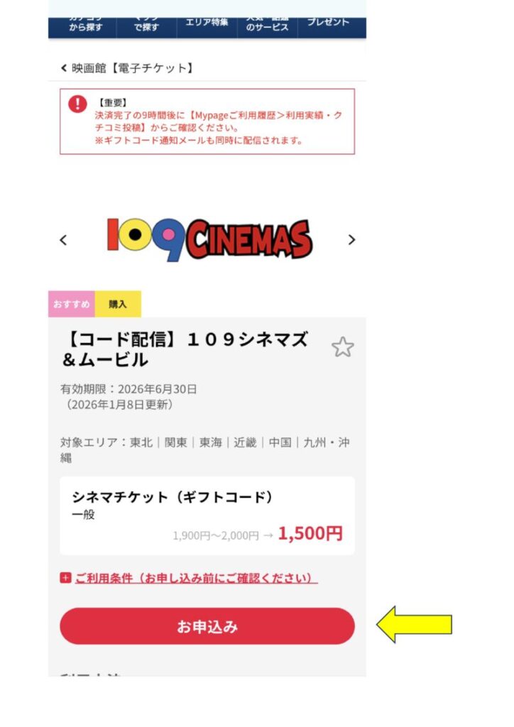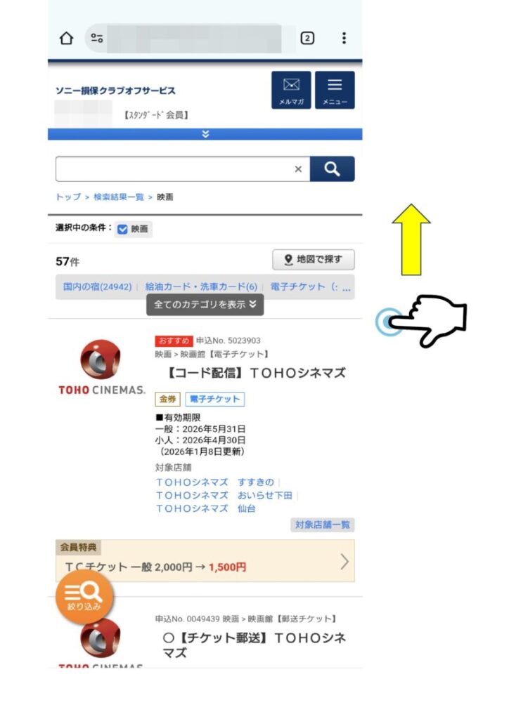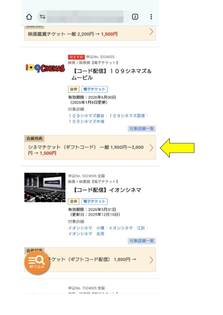 選択画面、TOHOシネマズのコード配信が先頭で表示された。 今回は109シネマズの電子コードを購入するつもりなので109シネマズコード配信を探す。 画面を上へスライド。