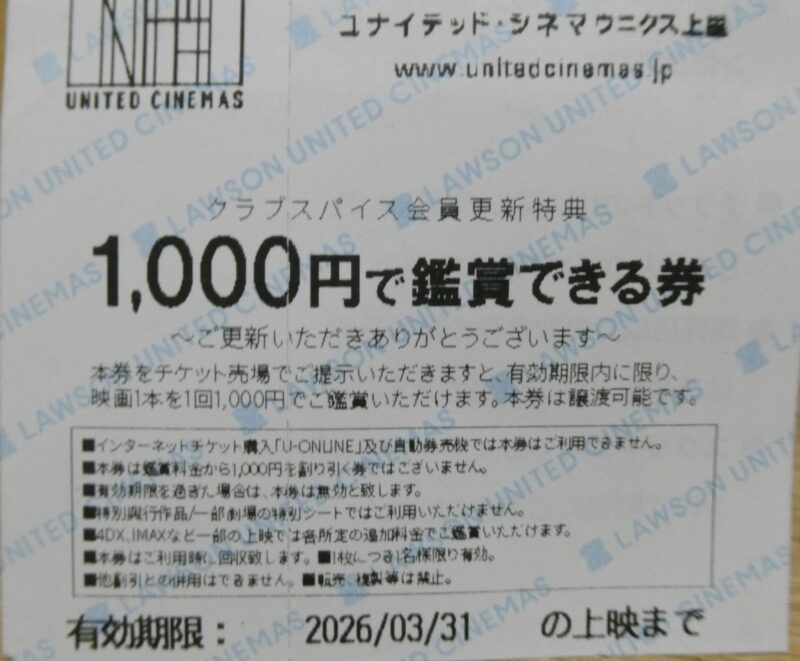 あと、先日ユナイテッドシネマのクラブスパイス会員の更新をした時にもらった1000円鑑賞券、2/26までPontaパス10周年キャンペーンで1200円で観られるのでその間は使わない。 2/27から3/31の間に使わないと。 財布に入れておくと他のレシートと一緒に捨ててしまいそうだし、他の所にしまうとそのまま忘れそうだし・・・。 割引券を持っているのはうれしいが実に悩ましいのだ。