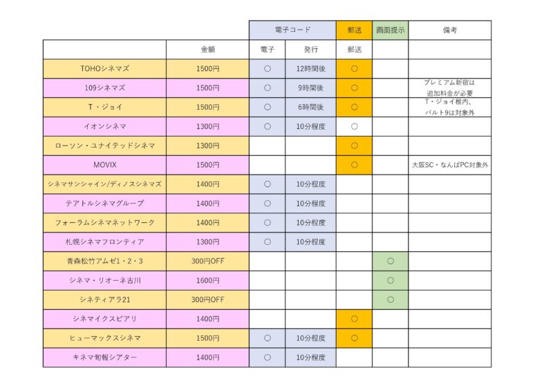 クーポンは3種類。 電子コード・郵送チケット・画面表示または印刷。 各劇場で取り扱うクーポンはまちまち。