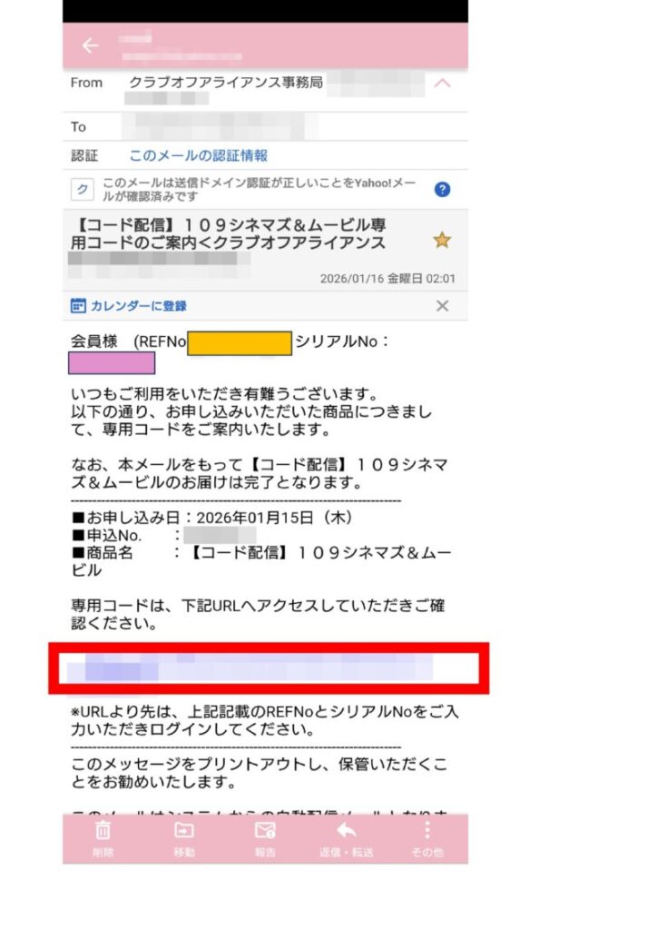 夜中の2時にメールが送信されてきた。 申し込んでから9時間は経っていないと思う。 画面上の赤枠の中のURLをクリックして内容を確認。 オレンジとピンクで塗りつぶしたところのNo.は次の画面で入力する。 あと、メールを消去しないようにしておかないと。
