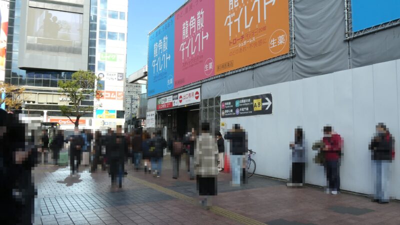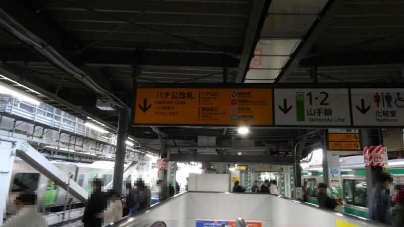 約1時間半で渋谷駅。 人が多い。 目指す出口はハチ公改札から宮益坂口だが一度トイレに行くため正反対の新南改札方面へ行ってみる。 新南改札付近だけ駅が完成してて綺麗だし、何となく空いてそうなので。