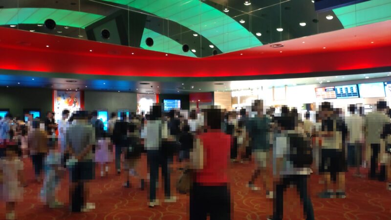 券売機も行列。 MOVIX系はだいたい機械1台毎に並ばせるので並ぶ場所によって当たり外れがある。 ヘタをすると上映時間に間に合わなかったり。