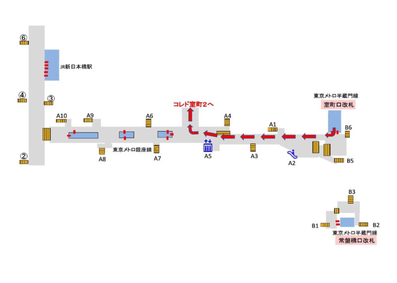 これは半蔵門線の室町口改札。 出て左のB6階段を上がれば日本橋の北詰に出る。