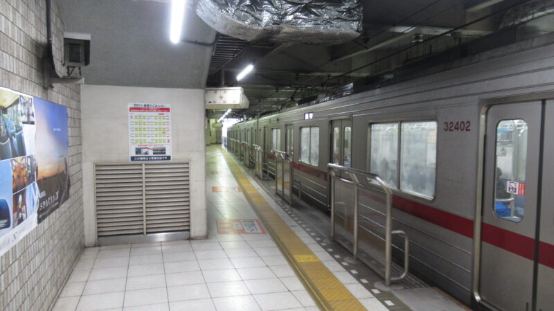 改札を抜けてホームへ降りると発車待ちの列車が停車中。 乗車するとすぐに出発し大手町駅で下車。