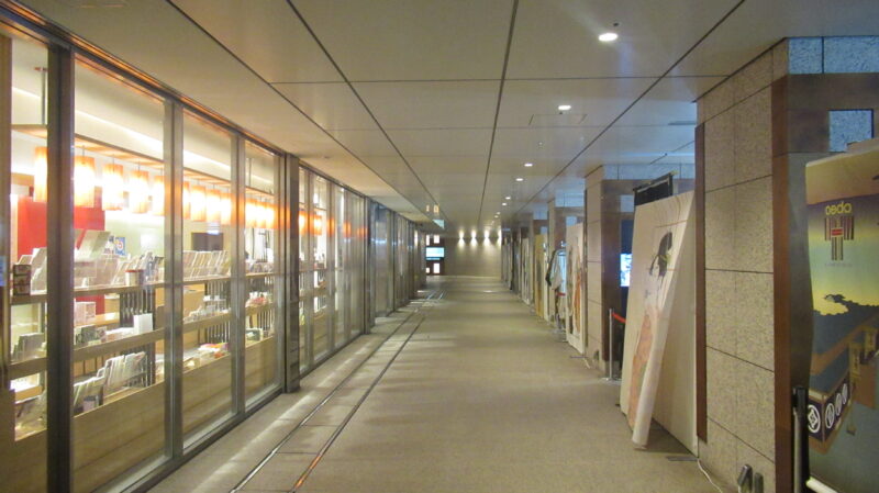 A4とA6の間の広い通路を右に曲がるが、今日は和服の即売みたいなイベントやってる。写真は普段の3分の1の広さの通路。 ここを進んでいくとコレド室町2のB1Fへ直結。