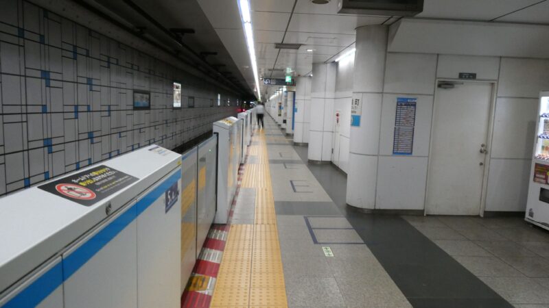 茅場町駅東西線ホーム。 さっきの木場駅より明るい感じ。