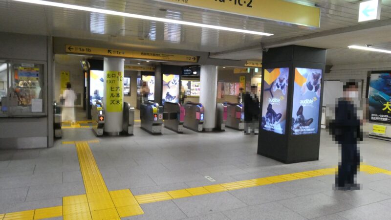改札まで来た。 1c、六本木ヒルズはナナメ左と案内してある。