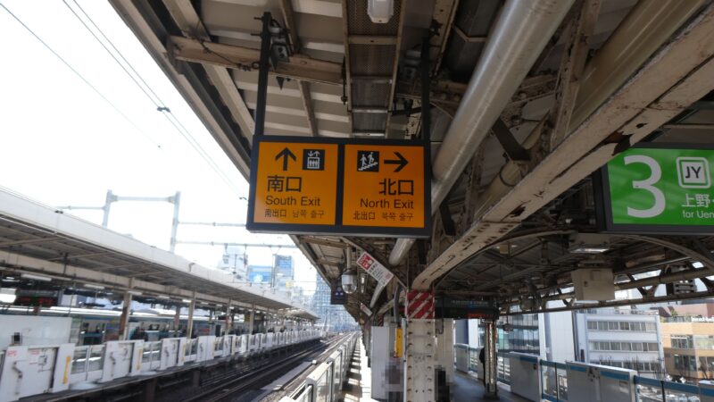 有楽町から4駅8分、あっと言う間に御徒町駅に到着。 出口は北口と南口で駅舎が分断されており降りる階段が分けられている。 映画館はどちらからでも行けるが南口の方が近いので南口へ向かう階段を降りる。